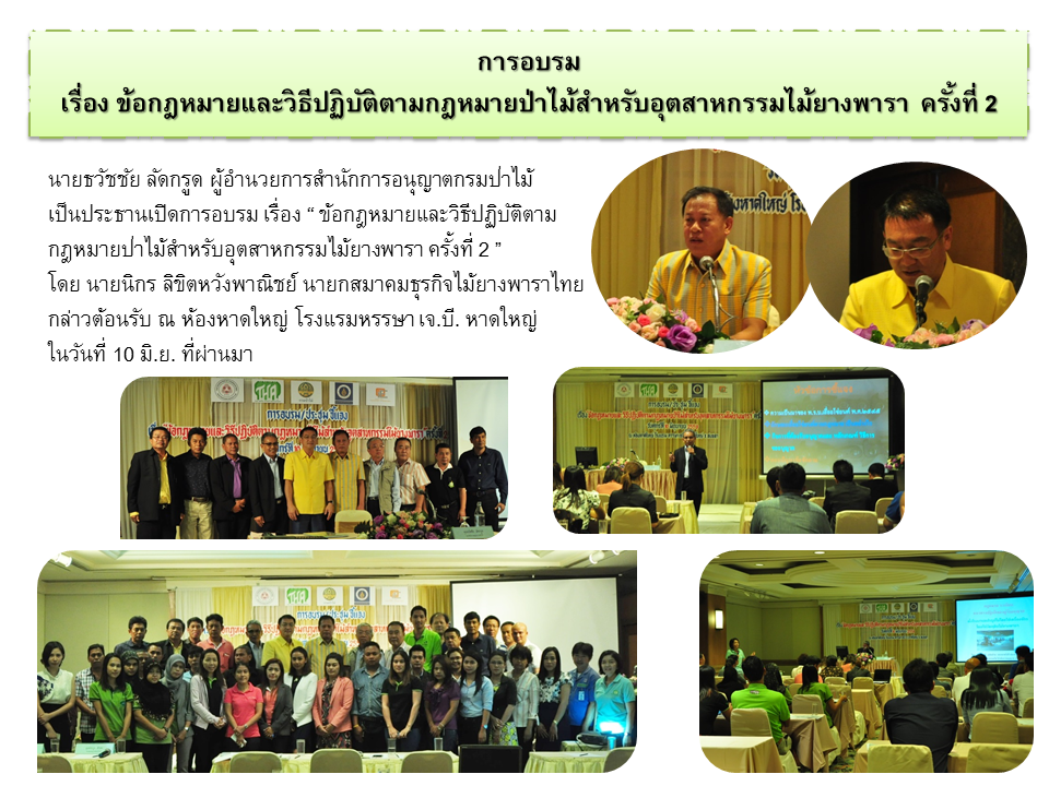 จัดการอบรม ประชุมชี้แจง เรื่อง ข้อกฎหมายและวิธีปฏิบัติตามกฎหมายป่าไม้สำหรับอุตสาหกรรมไม้ยางพารา ครั้งที่ 2 ในวันศุกร์ที่ 10 มิถุนายน 2559 เวลา 08.30 - 17.00 น. ณ ห้องหาดใหญ่ โรงแรมหรรษา เจ.บี. อำเภอหาดใหญ่ จังหวัดสงขลา